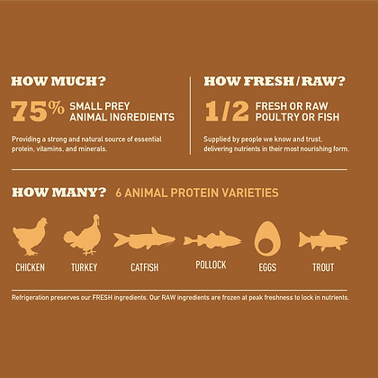 Con un 75% de carne, ACANA Meadowland contiene pollo de corral, pavo , huevos del nido, bagre azul y trucha arcoíris. Nuestra carne se entrega fresca o cruda diariamente en proporciones de Presa Entera para semejar la dieta evolutiva de tu gato y promover la salud óptima sin largas listas de suplementos o aditivos sintéticos.