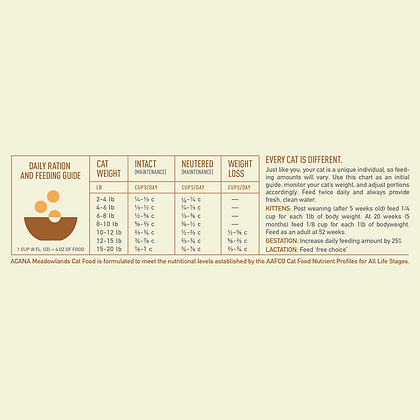 Preparados en nuestras cocinas DogStar en Kentucky con los mejores y más frescos ingredientes de América, ACANA Meadowland garantiza mantener a tu gato saludable, feliz y fuerte.