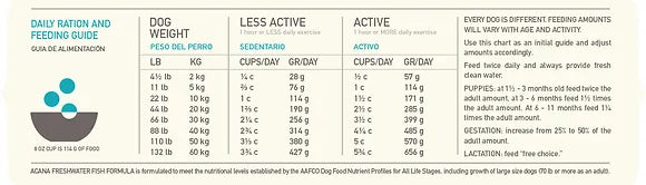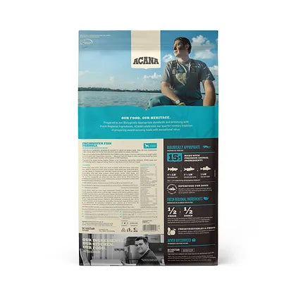 Por eso cargamos ACANA FRESH WATER FISH con trucha arco iris de Idaho, bagre azul entero de Kentucky, y perca salvaje de los Grandes Lagos. Todo ello en nutritivas proporciones WholePrey TM (presas completas).