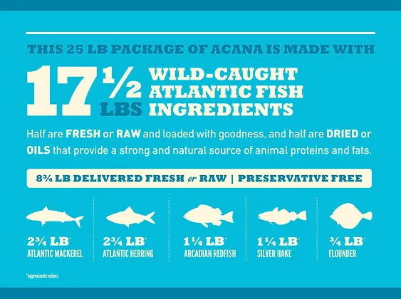 Entregado fresco en proporciones de PresaEntera para conservar su calidad natural, la rica diversidad de pescado de agua salada en ACANA semeja la dieta evolutiva de tu perro, sin largas listas de suplementos o aditivos sintéticos.