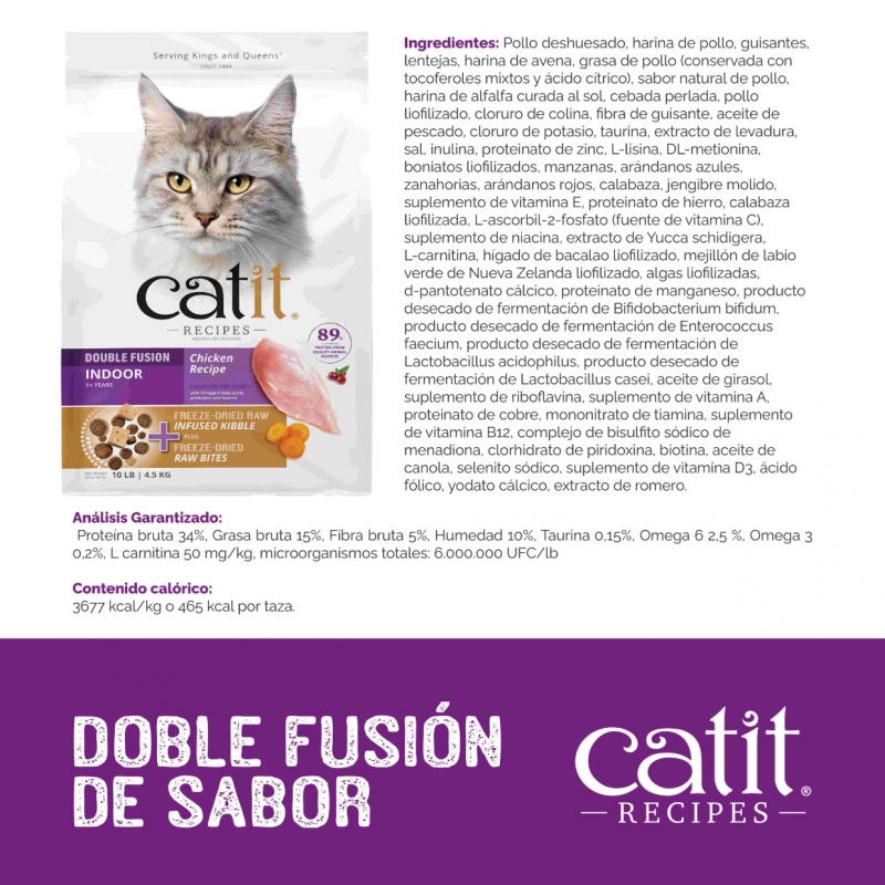 Catit Recipes DOUBLE FUSION Indoor – Receta de Pollo está diseñado para gatos que llevan un estilo de vida en interiores, ofreciendo una dieta equilibrada que ayuda a controlar el peso y reducir las bolas de pelo. La combinación de croquetas crujientes y trozos de carne cruda liofilizada proporciona una textura y sabor irresistibles. El pollo de alta calidad garantiza una fuente de proteína magra, mientras que los ingredientes naturales apoyan la salud digestiva y urinaria.