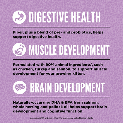 Con un 40% de nutritiva proteína, y limitando al 19% los carbohidratos de bajo índice glicémico para nutrir a los gatos y gatitos de acuerdo a su necesidades biológicas y evolutivas.