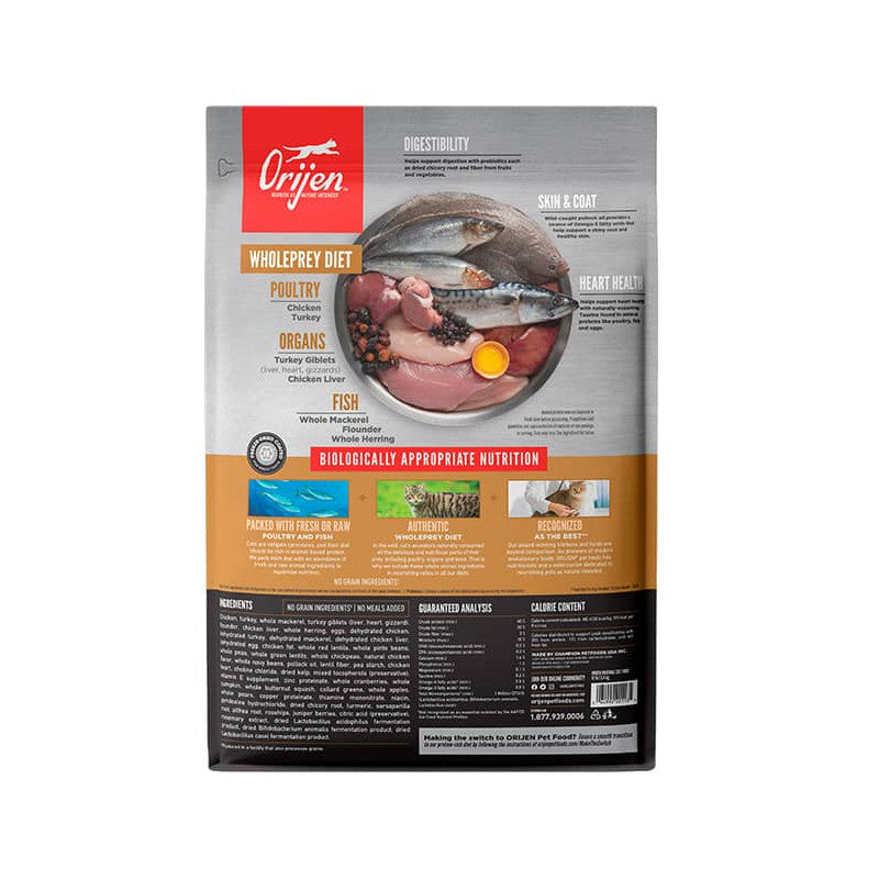 Orijen Origina Cat es un alimento biológicamente apropiado™ indicado para gatos y gatitos que refuerza sus necesidades evolutivas y biológicas. Con 40% de proteína rica en nutrientes, y limitado a 19% de carbohidratos de bajo índice glucémico. Libre de harinas de aves de corral.