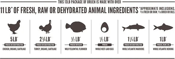 Libre de carnes derretidas de aves de corral, 1/3 de las carnes son de pollo y pavo deshidratado (carnes frescas que se secan al ser expuestas a baja temperatura) para lograr una concentrada fuente de nutritiva proteína.