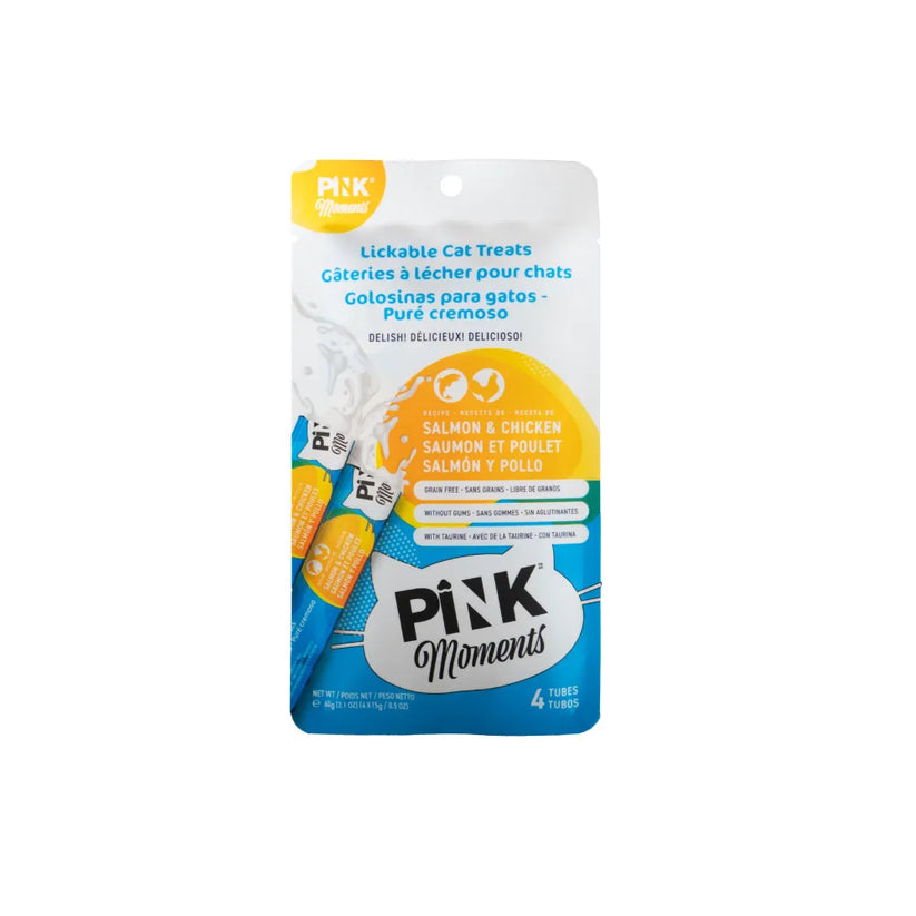Pink Moments Salmón 4 Tubos es un snack cremoso para gatos, elaborado con salmón como ingrediente principal, ideal como premio ocasional, complemento de la dieta o para reforzar el vínculo con tu mascota. Su textura suave y palatable encanta a los gatos y aporta hidratación extra en cada porción.