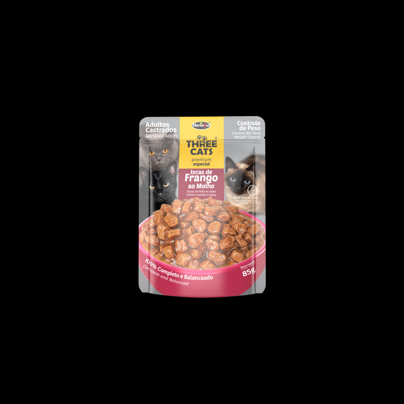 El Sachet Three Cats Original Adultos Castrados Pollo es un alimento 100% completo y equilibrado, bajo en sodio y con cantidades adecuadas de minerales para favorecer la salud del tracto urinario de los felinos. El sabor Trocitos de Pollo en Salsa su cocción al vapor y tiene reducción calórica, lo que ayuda a controlar el peso de los felinos. Todo para que su gato disfrute de una comida segura, completa y saludable.