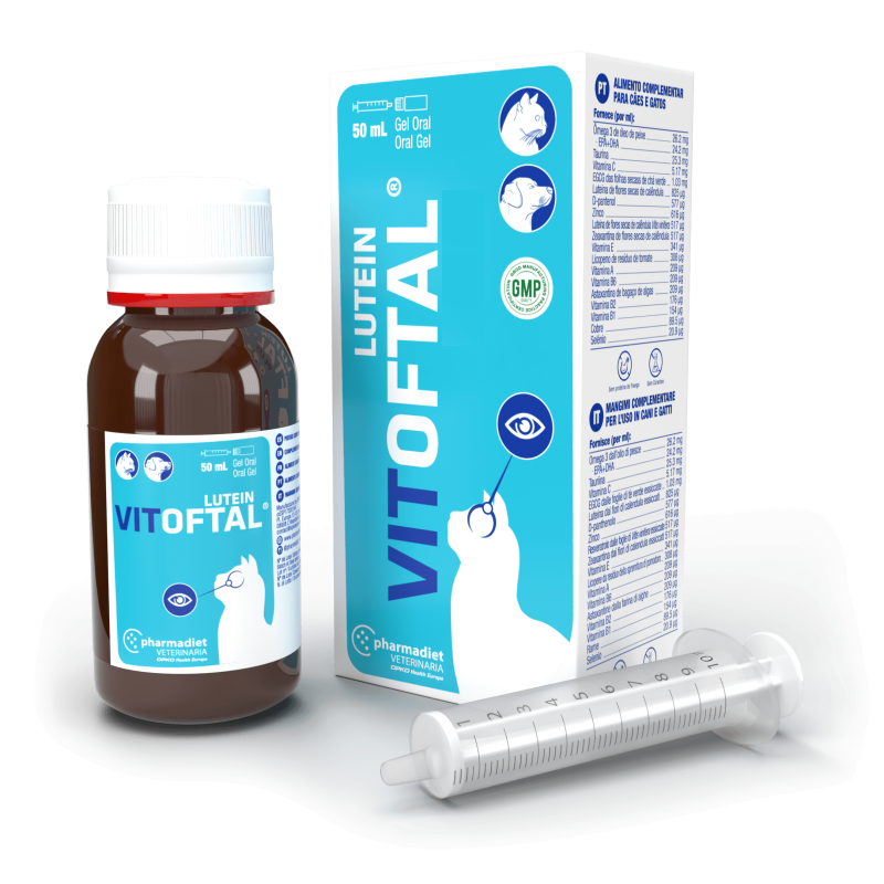 Vitoftal es un suplemento nutricional para perros y gatos, que ayuda a proteger los tejidos oculares, como la retina, el cristalino y el nervio óptico, manteniendo también la calidad de la lágrima.