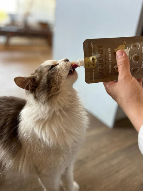 Pouch para gatos de de sabor pollo con textura suave y untable, ideal para consumo directo de la boquilla.