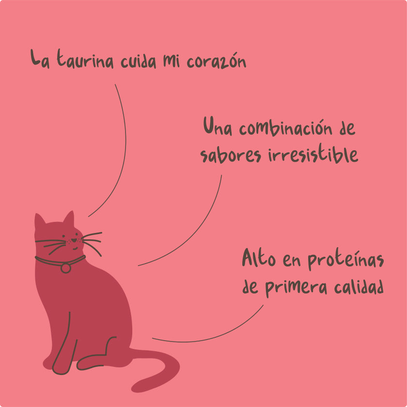 Función: Una combinación deliciosa de salmón y pollo, que además cuida la salud cardíaca de tu gato gracias a la taurina.