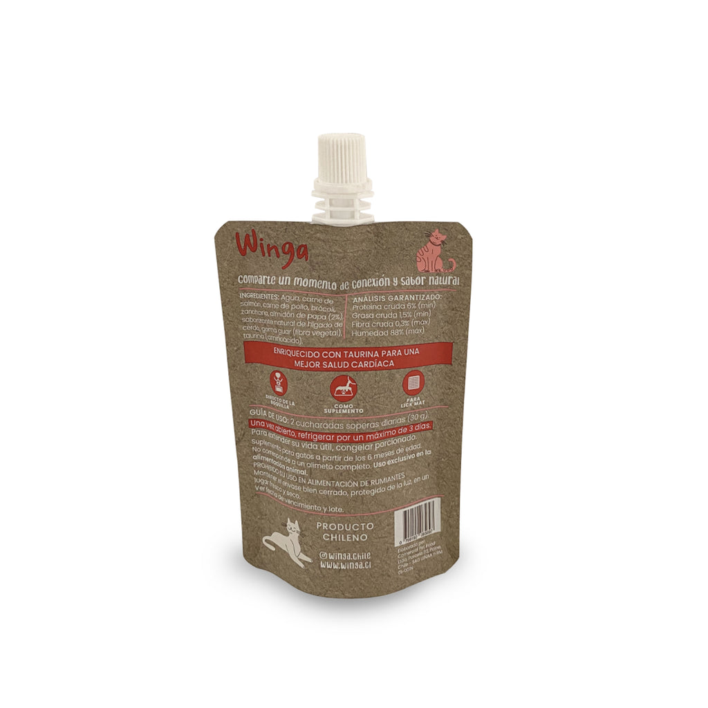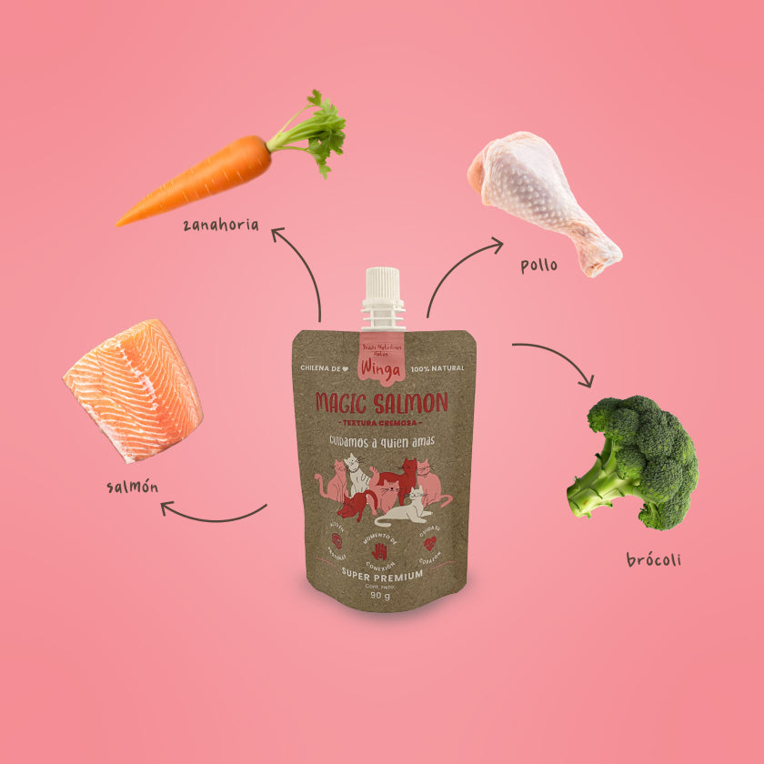 Ingredientes: Agua, carne de salmón, carne de pollo, brócoli, zanahoria, almidón de papa (2%), saborizante natural de hígado de cerdo, goma guar (fibra vegetal), taurina (aminoácido).